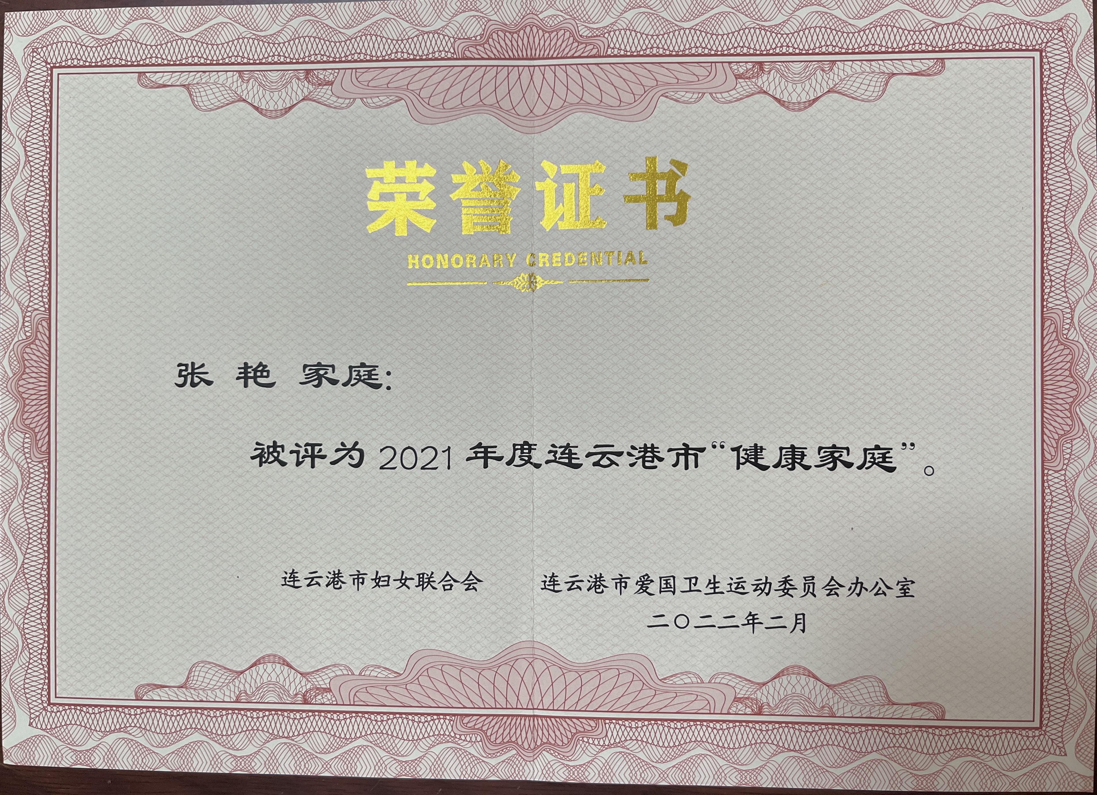 日前,连云港市妇联、市爱卫办联合开展了2021年度健康家庭推选活动,通过组织推荐,汽服公司基层工会干部张艳的家庭被评为“2021年度连云港市健康家庭”。