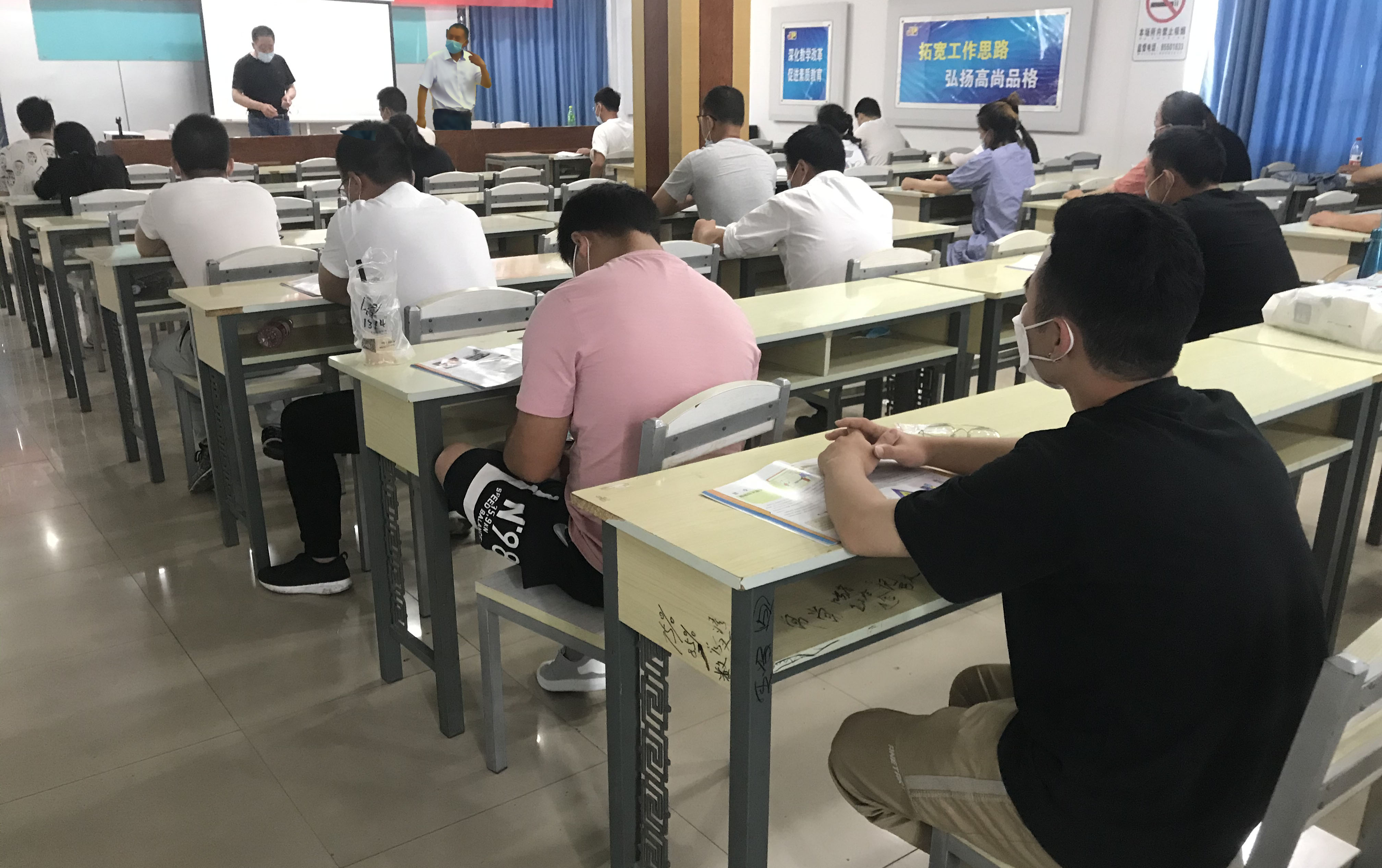 为做好培训期间的疫情防控工作,保障学员的健康和培训顺利进行,提前两日对校园及教室进行全面消杀,控制教室人员密度,保持1米间隔,向学员讲解疫情期间开班注意事项,期间,每天对进门学员进行体温测量并做好登记,每名到校学员必须出示苏康码,全程佩戴口罩,在保持良好课堂秩序的同时确保校园疫情防控取得实效。