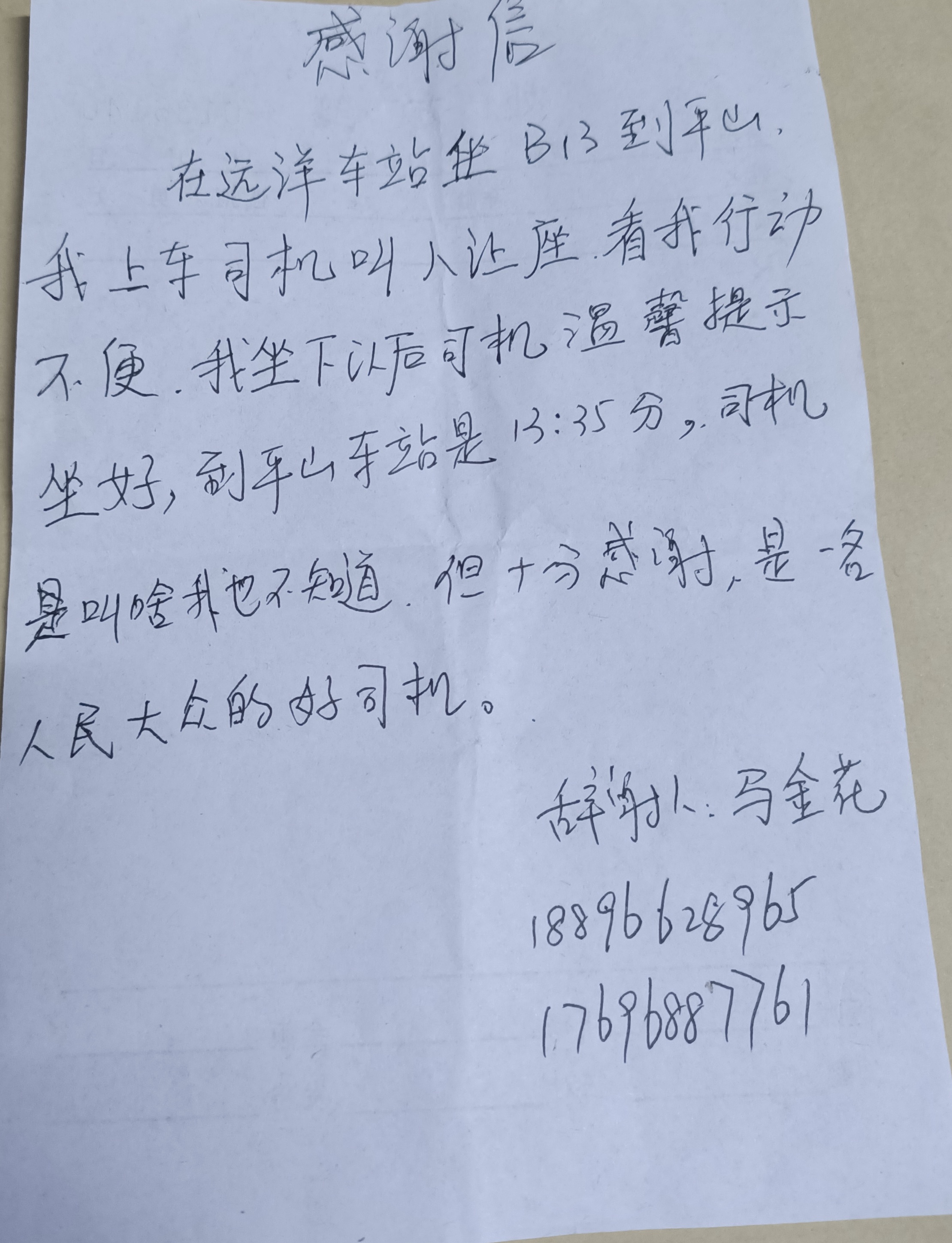 原来,7月29日中午13:00左右,市民马阿姨因腰部疼痛要到平山诊疗室去针灸治疗。当她在远洋楼站乘坐B13车时,因腰部疼痛,上车时特别吃劲,驾驶员曹华伟一直耐心等待,让她不要着急,上车后又主动帮她找座位,还请其他乘客帮忙搀扶坐好后才继续运营。在得知马阿姨到平山站下车时,曹华伟又特意将车一点一点贴近站台停靠,以方便马阿姨下车并叮嘱她注意安全。这让马阿姨特别感动,她在电话中激动地说,“我活了62年,坐了这么多年公交车,从来没有遇到过这样好心的驾驶员,不仅服务热情还特别有亲切感,对待乘客就像对待自己的家人一样,他的一声声关怀、叮嘱深深温暖了我的心,让我内心感动至极。”于是她在下车时特意看了一下站台时间13:35,当她到诊疗室后,又第一时间向医院要了张纸写下了这封感谢信,生怕自己因年纪大而忘记此事。在诊疗完后,拜托站务员将这封感谢信带到东城调度室以表达她的感谢之意。
