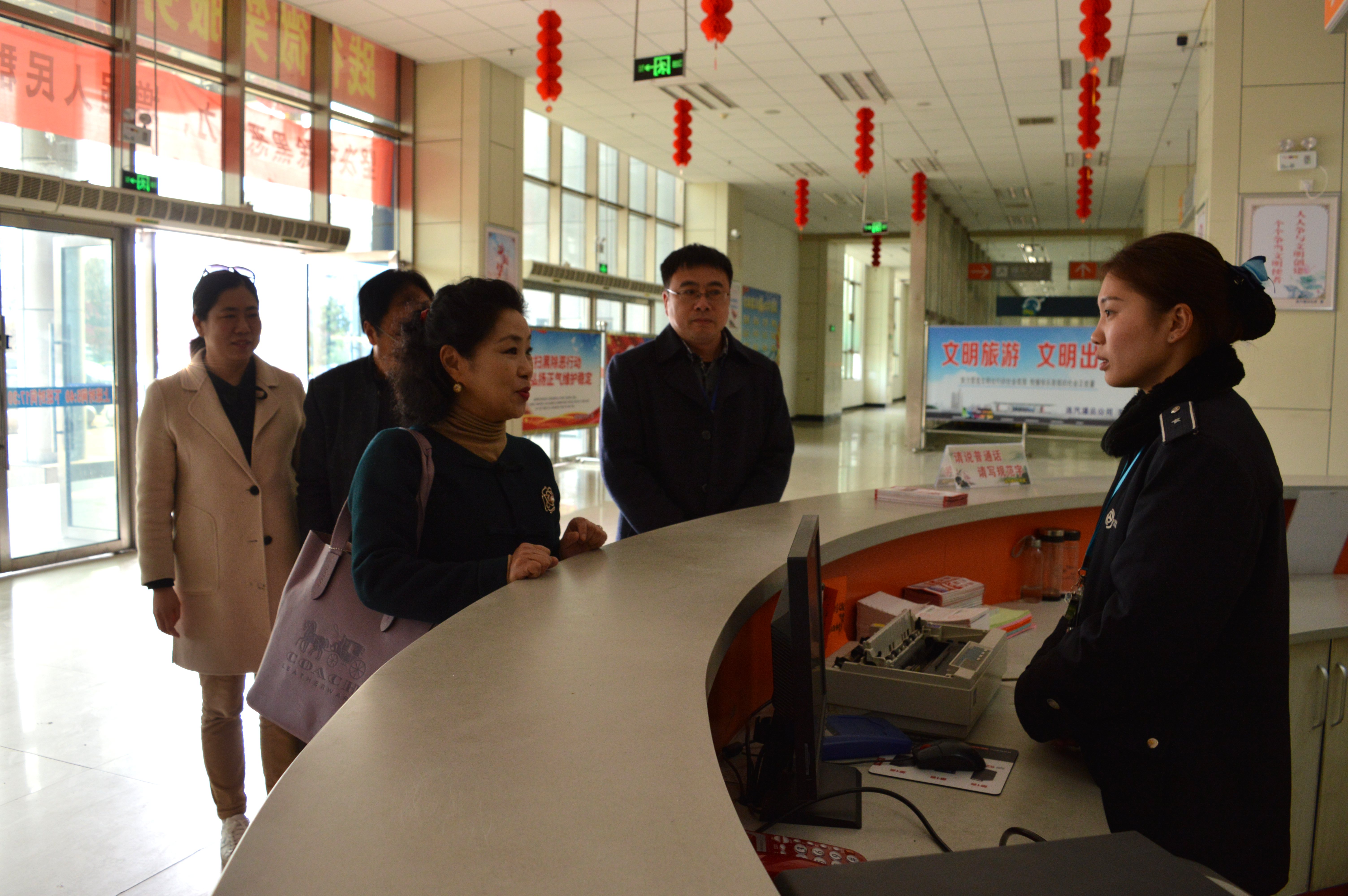 检查督查组认真听取了客运站语言文字工作及普通话推广情况的汇报,并通过现场提问、实地验证等形式对客运站的语言文字规范化工作进行了全方位考察和评估。督查组实地查看了客运站场、候车大厅、售票大厅、安检台的指示牌、宣传栏、电子屏幕标语用字用语是否规范,并对检票口工作人员的服务用语、用字规范进行了检查,同时询问旅客服务中车站工作人员是否使用普通话、文明用语。