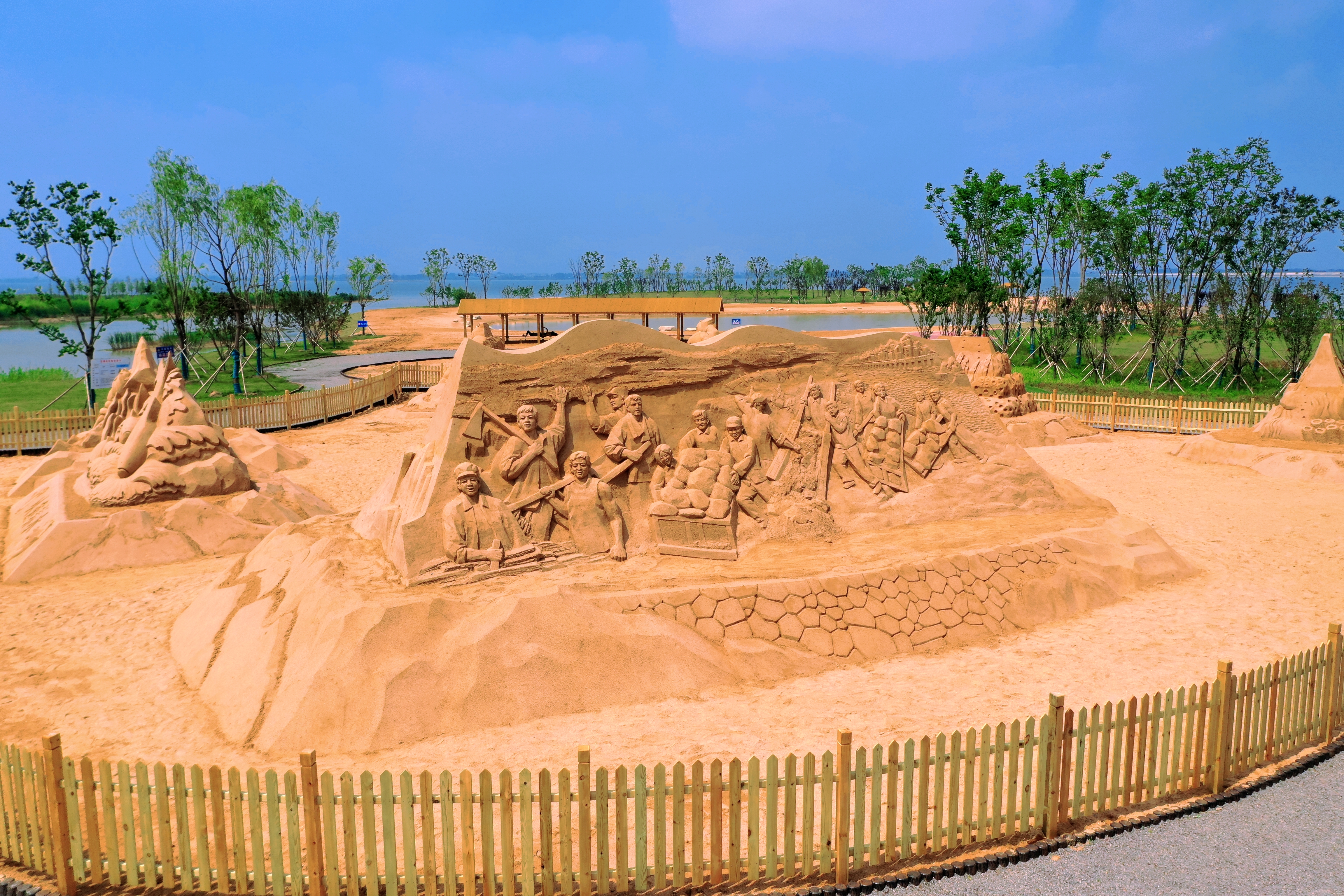 围绕“沙”元素,“趣味沙世界”主题区以沙雕展示为主,七大主题的特色沙雕环绕排列,主沙雕《日月征程》展示了库区群众沧桑六十余载对水库一刻不停的建设和守护,《海陵湖的传说》、《神往之地》、《渔舟芭蕾》、《知鱼之乐》、《小猫钓鱼》、《连年有鱼》等主题将石梁河水库方方面面的文化民俗精华尽数呈现;“迷你亲子水世界”主题区,利用原有滩地的凹地,以生态塘+浅水沙滩的形式设计了一处可观、可玩的亲子互动沙滩区;“房车营地”配有可租借帐篷、小木屋、运动游乐设备等露营设施;“星空露营基地”设置在杉树林中,三面环水,与海陵湖秀丽的湖光相互映衬。“月亮湾”为“黄金沙滩”的主沙滩区,因其月牙的造型而得名,是欣赏海陵湖风光的最佳区域。