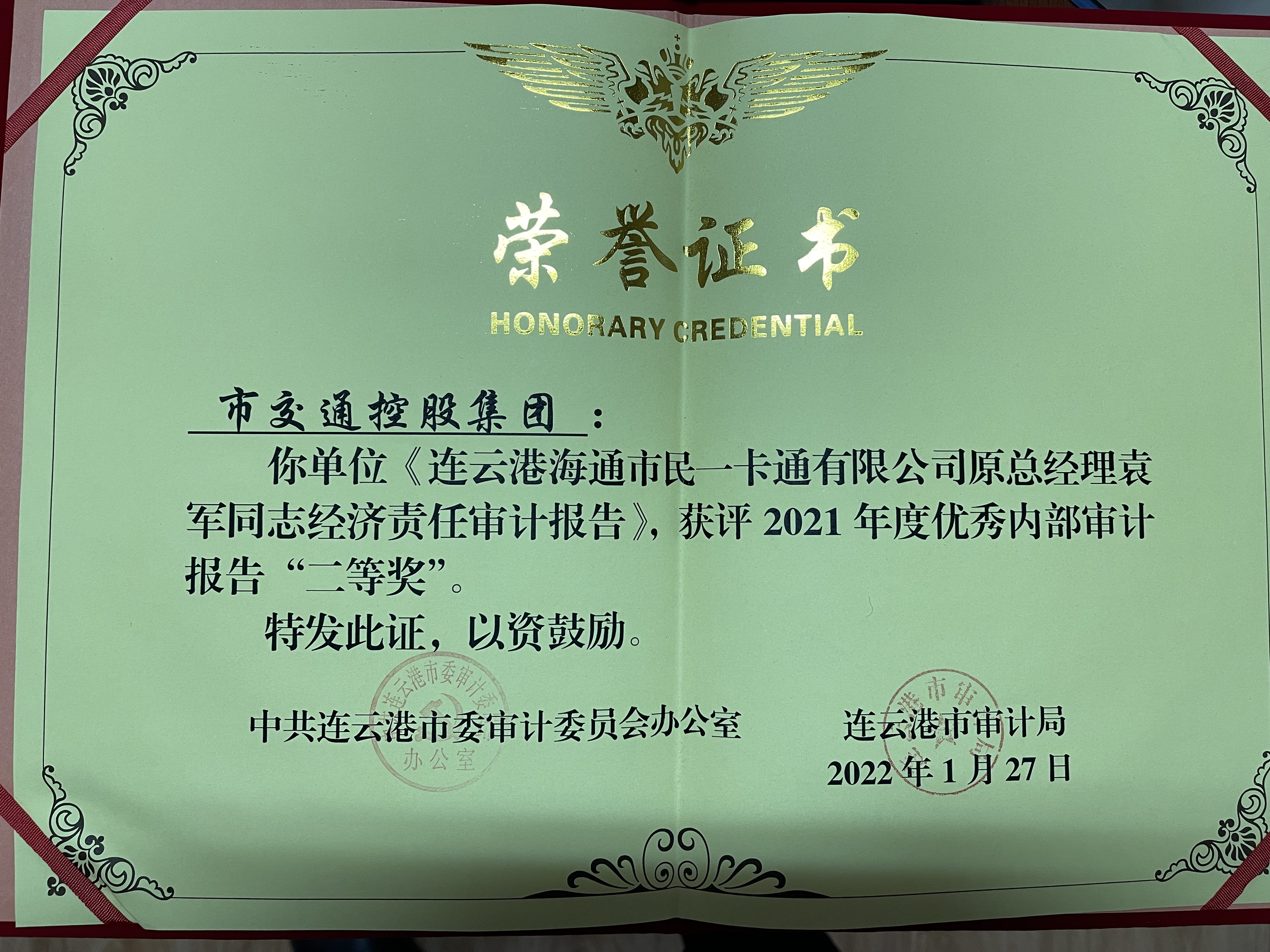 近日,半岛app最新版下载,半岛(中国)审计部出具的审计报告——《连云港海通市民一卡通有限公司原总经理袁军同志经济责任审计报告》,在审计局组织有关人员对2021年度全市内部审计报告开展评选工作中获得连云港市委审计委员会和连云港市审计局共同颁发的2021年度优秀内部审计报告“二等奖”。