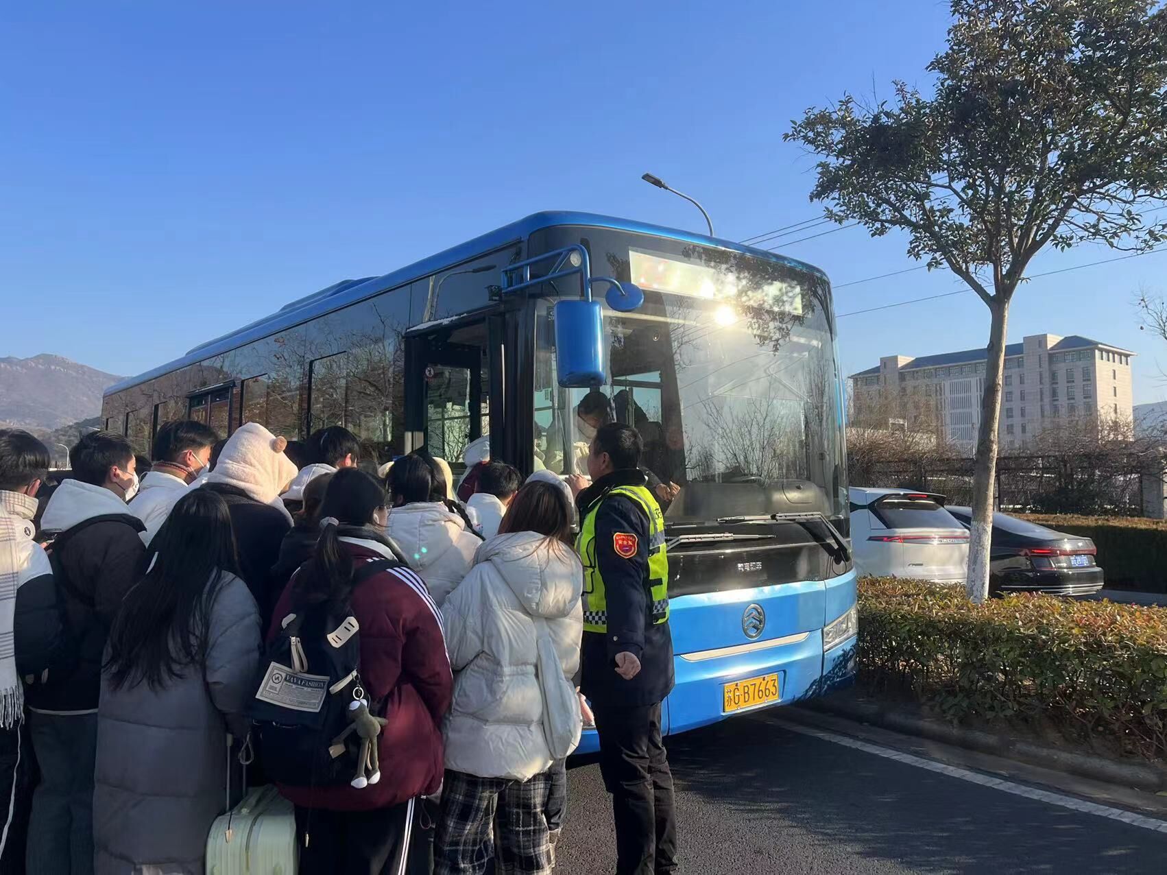 现场安排安管后服人员在各大院校公交站点现场管理车辆停靠,有序指挥引导公交车辆安全进出站点,以及对驾驶员进行安全行车和文明服务交代,并为学生提供相应的帮助,如搬运随身携带行李箱,下载支付软件,引导学生有序乘车等。不少学生对安管人员的帮助表示感谢,称每周公交半岛app最新版下载,半岛(中国)职工都会来大学城附近现场管理,为他们的出行提供便捷,真的很不容易,在寒冷的冬日里让他们让感到无比温暖。