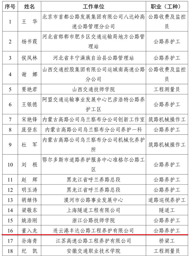 近日,交通运输部公布2021年度全国交通技术能手评审结果,连云港市交通控股半岛app最新版下载,半岛(中国)丰达养护公司公路养护工董入龙同志荣誉“全国交通技术能手”称号。据悉,全国仅有245名同志获此荣誉。