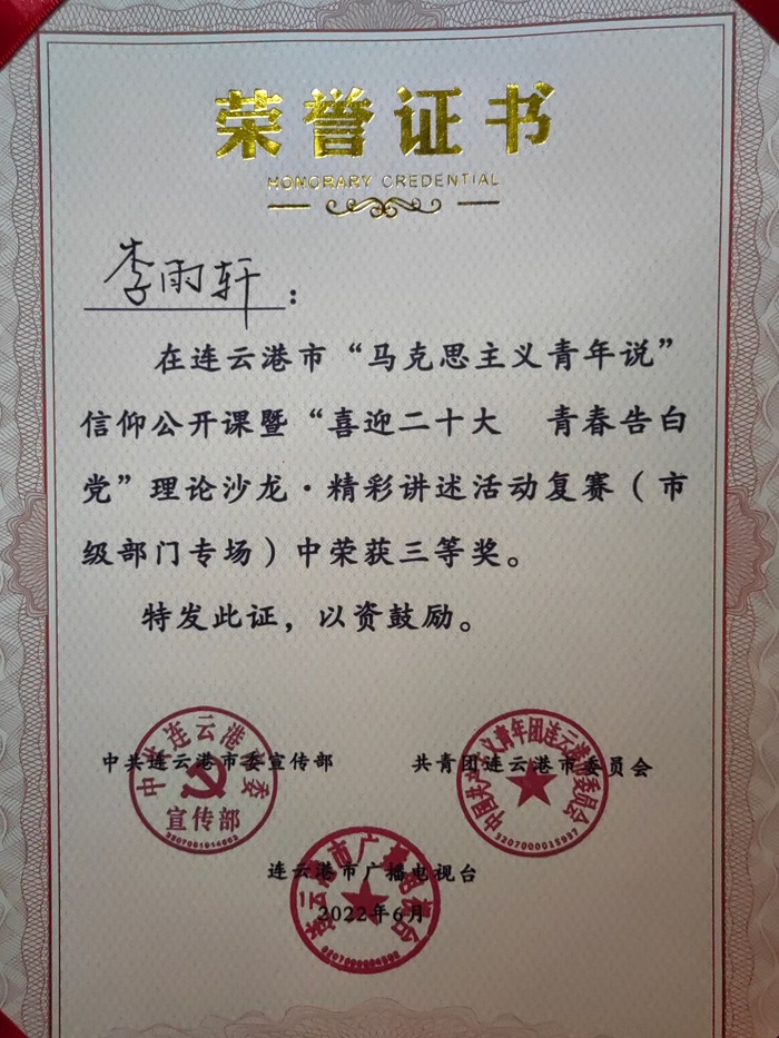 6月21日,市委宣传部、团市委、市广播电视台联合举办的连云港市“马克思主义青年说”信仰公开课暨“喜迎二十大 青春告白党”理论沙龙·精彩讲述活动复赛(市级部门专场)落下帷幕。新浦汽车站总站李雨轩在此次比赛中荣获三等奖。