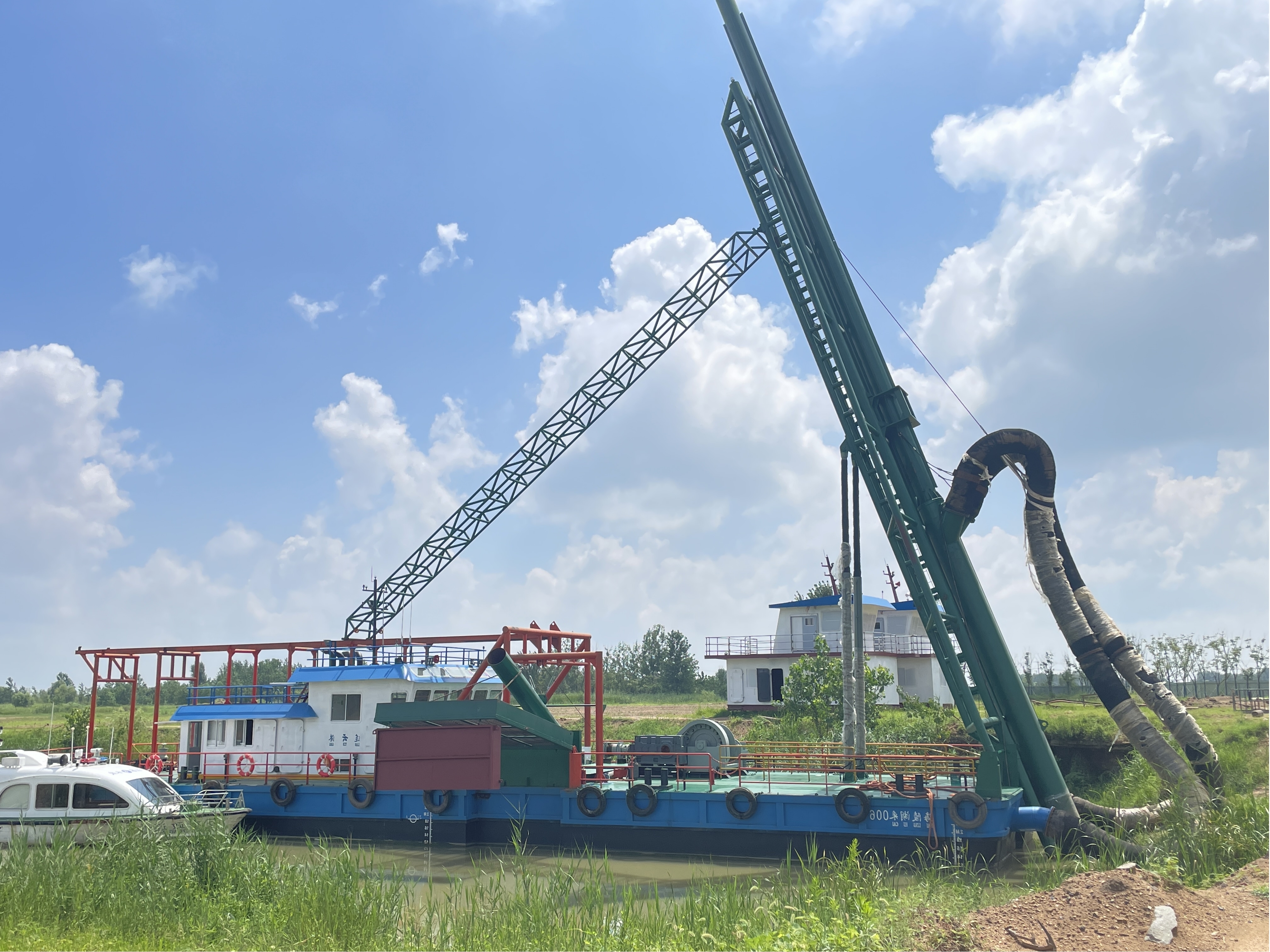 海陵湖采006号200方/小时吸泥船由海建公司委托盐城市天人合船舶有限公司建造。建造期间,全体工作人员充分发挥不怕苦、不怕累的精神,迎着朝阳,伴着晚霞,克服种种困难,经过不懈努力,最终完成吸泥船组装工作。