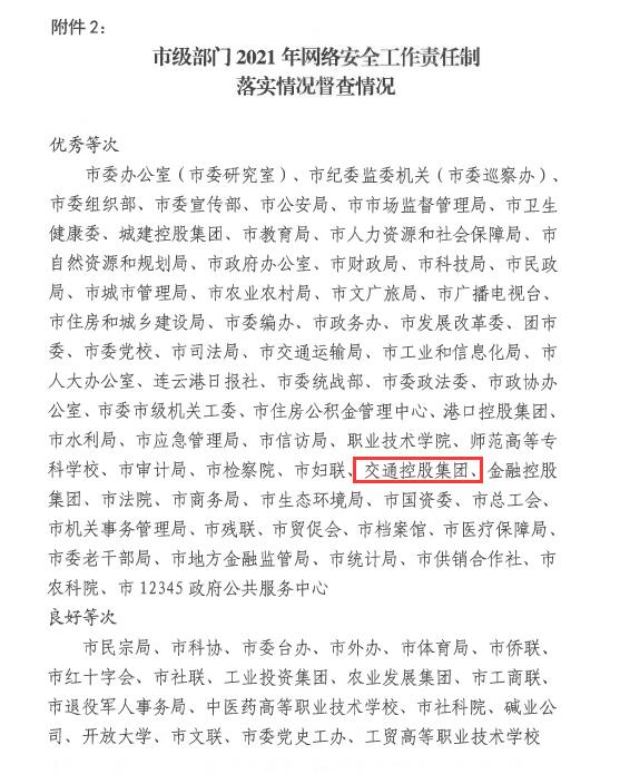 日前,市网信办通报2021年度全市党委(党组)网络安全工作责任制落实情况督查检查结果,半岛app最新版下载,半岛(中国)被评为优秀等次。