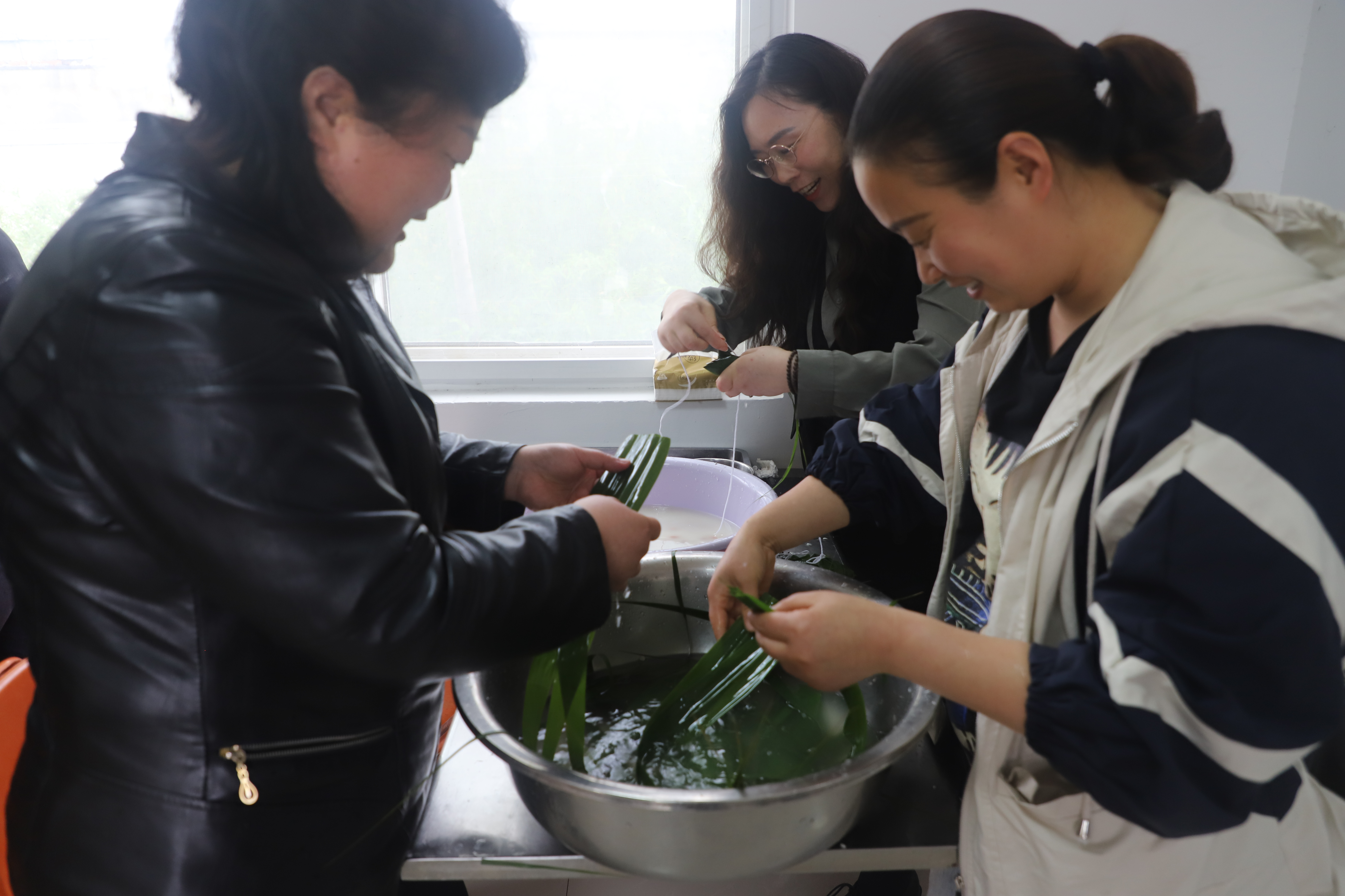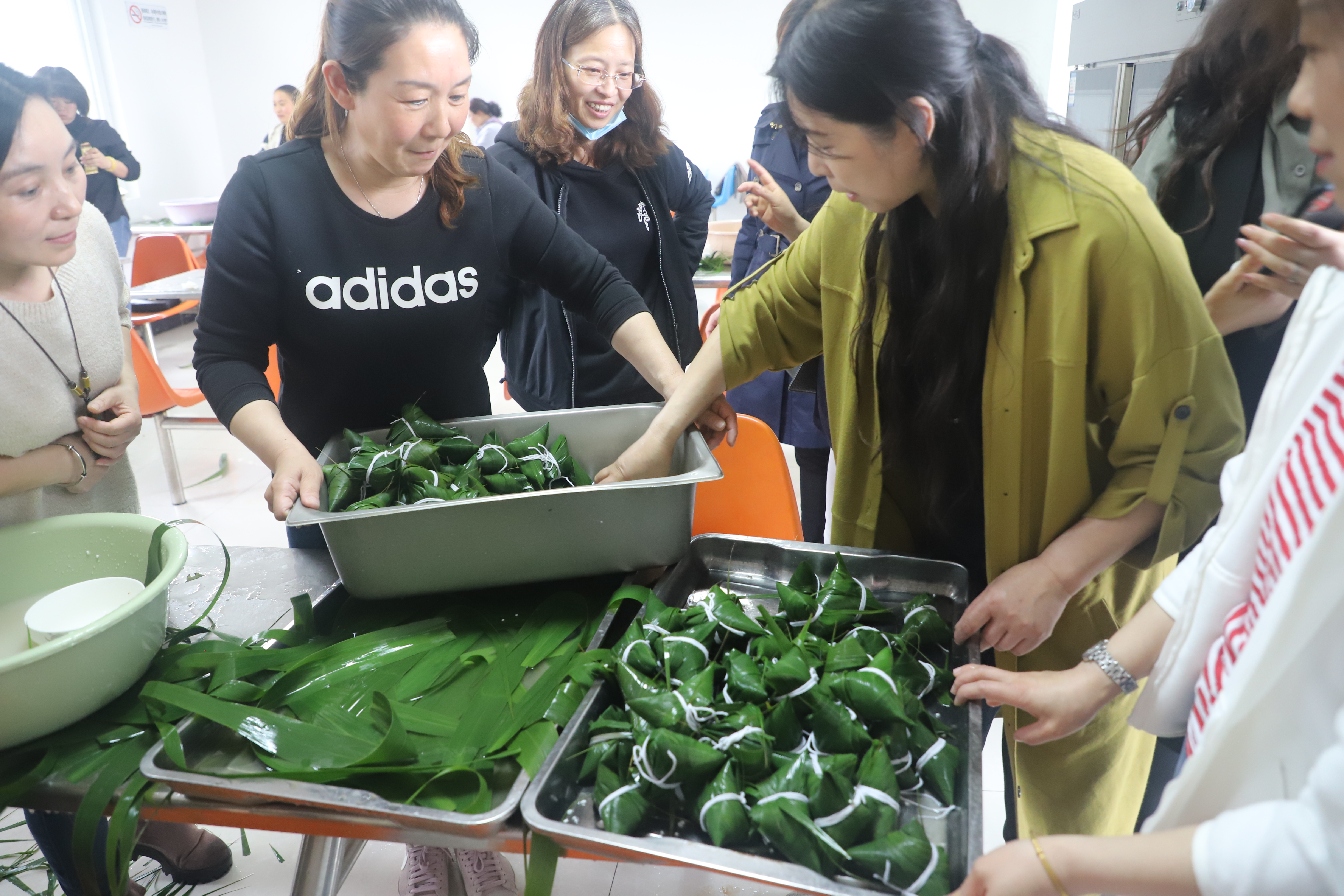 活动现场,公司女职工们三人为一组围着方桌,个个干劲十足,热情满满,清香的粽叶、晶莹的糯米,在一双双巧手下翻转飞舞,变成一个个精致美味的粽子,整个活动现场其乐融融。