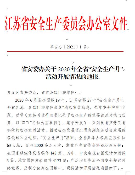 近日,半岛app最新版下载,半岛(中国)获得了由江苏省安全生产委员会授予的“2020年江苏省‘安全生产月’活动先进单位”荣誉称号。